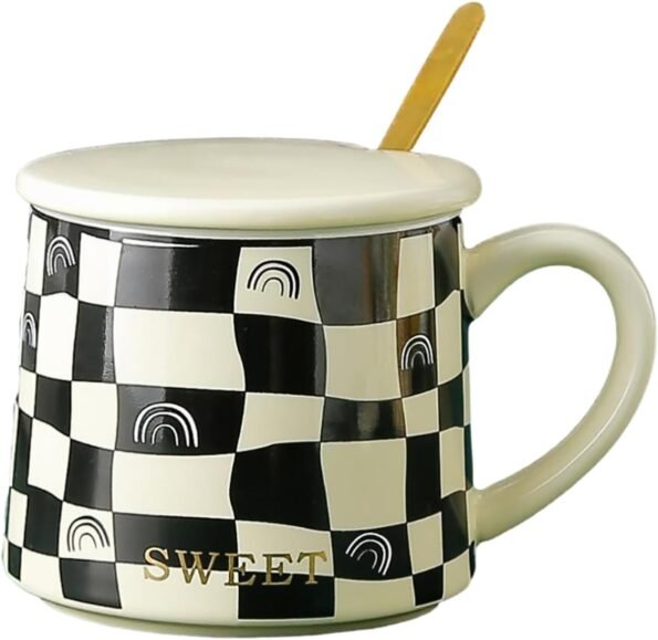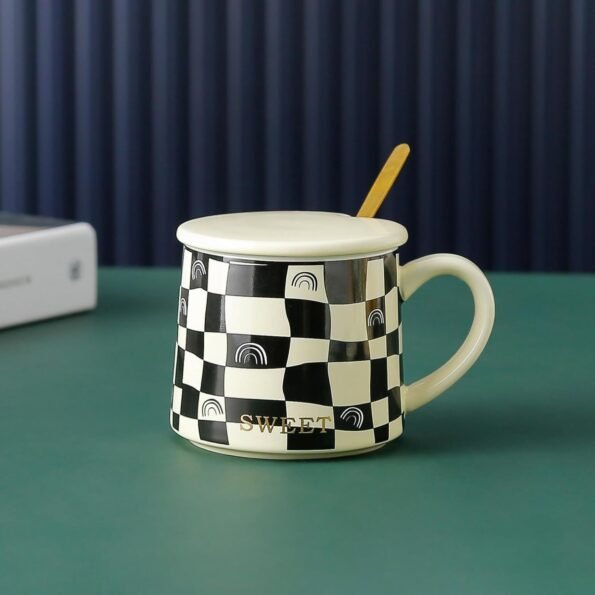 300ml/10oz Retro Checkerboard Ceramic Mug Office Home Coffee And Milk Cup-B model (lid+spoon)